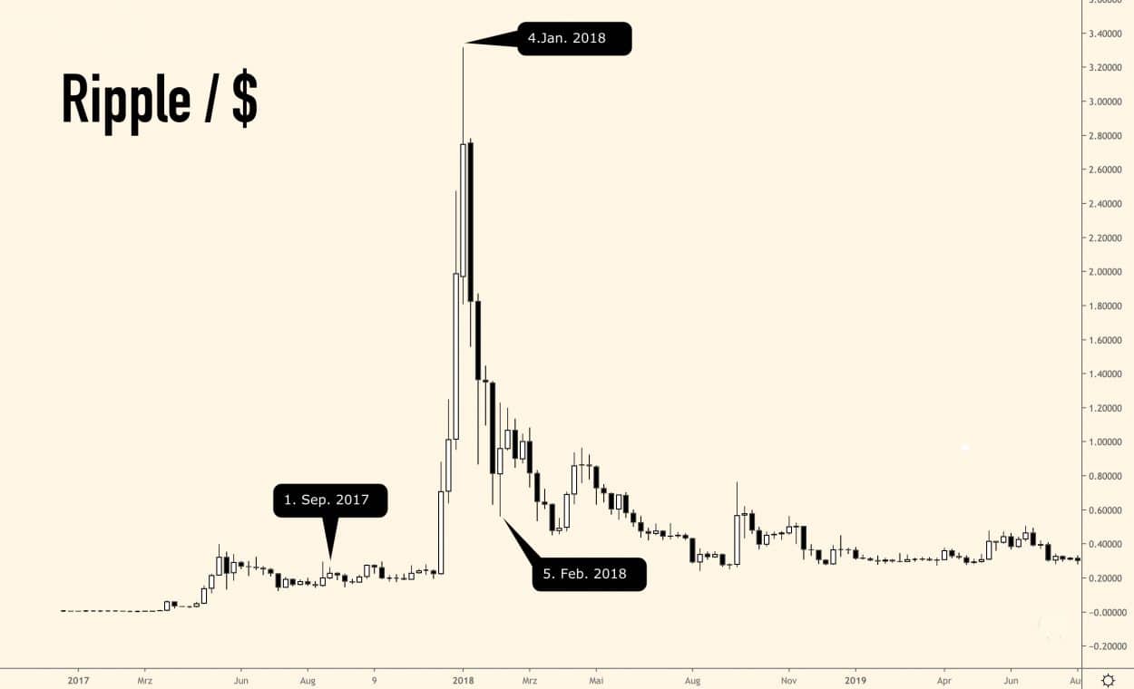 Es gab jedoch nur ein kleines Problem. Nach meiner mäßigen Saison als Star-Fotograf hatte ich nur bescheidene freiverfügbare Mittel zur Verfügung. Also sammelte ich alles schnell verfügbare Geld zusammen, um am 1. September 2017 ca. 15.000 Dollar als erstes Investment in das Kryptouniversum zu transferieren. Ich vergesse alle Worte der Weisheit, die ich über Risikomanagement und die Notwendigkeit der Diversifizierung gehört habe und lege alle meine Karten auf eine einzige Altmünze namens Ripple. Die Entscheidung, in diese bestimmte Währung zu investieren, beruhte nicht auf fundierter Logik und gründlicher Forschung oder Kenntnisse über die zugrunde liegende Technologie, noch hatte ich ein vages Verständnis für das Problem, welches das Protokoll angeblich löste. Es war nichts anderes als der Reiz, Tausende von Münzen zu besitzen, als einige wenige, der sich als entscheidender Faktor erwies. Ein einziger Coin von Ripple kostete zu diesem Zeitpunkt 25 Cent und dies bedeutete, dass meine anfängliche Investition mir ca. 60.000 Ripple Coins einbrachte. Klingt ja irgendwie auch viel mehr, als zum damaligen Kurs, 3 Bitcoin zu besitzen.